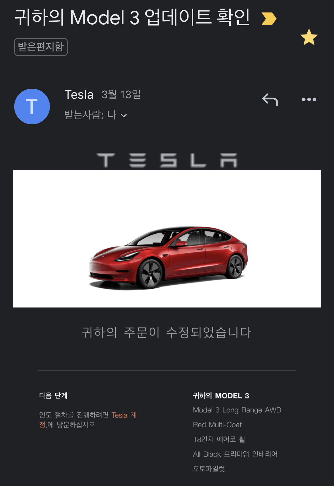 5,999만원짜리 테슬라 모델3 롱레인지 추가 옵션은 차량 색상 블랙 주문을 넣었다